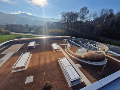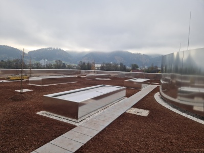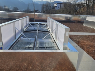 Beim Neubau der Pankl Academy wurde eine speziell angepasste Lösung für die Installation der Rauch- und Wärmeabzugs-Lüfter im begrünten begehbaren Flachdach entwickelt. Dabei wurde darauf geachtet, dass das System sowohl funktional als auch optisch unauffällig integriert wird. Die Lüfter befinden sich an strategischen Punkten auf dem Dach, sodass im Brandfall eine schnelle und effiziente Ableitung von Rauch und Wärme möglich ist.